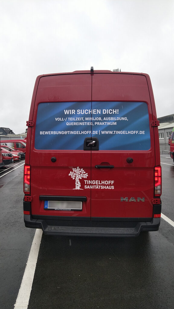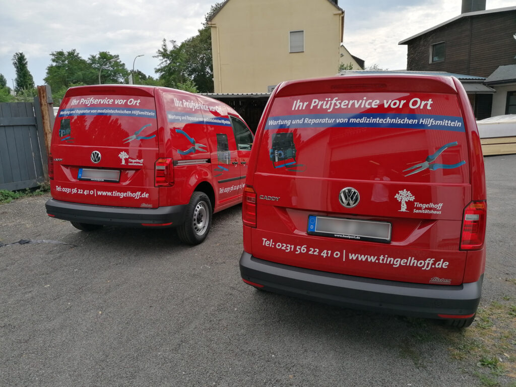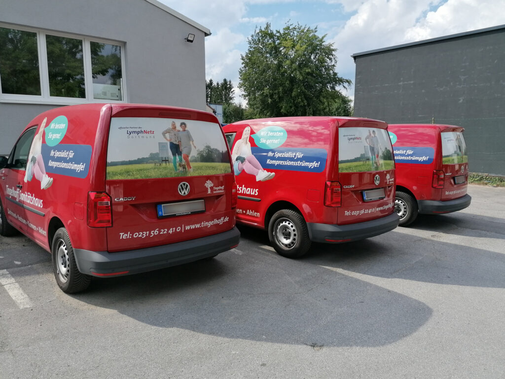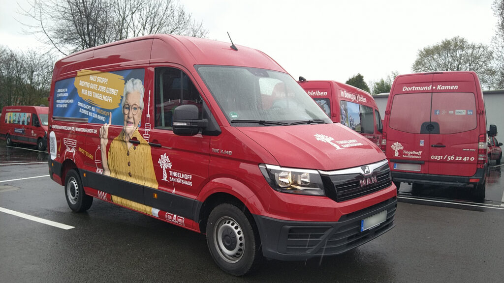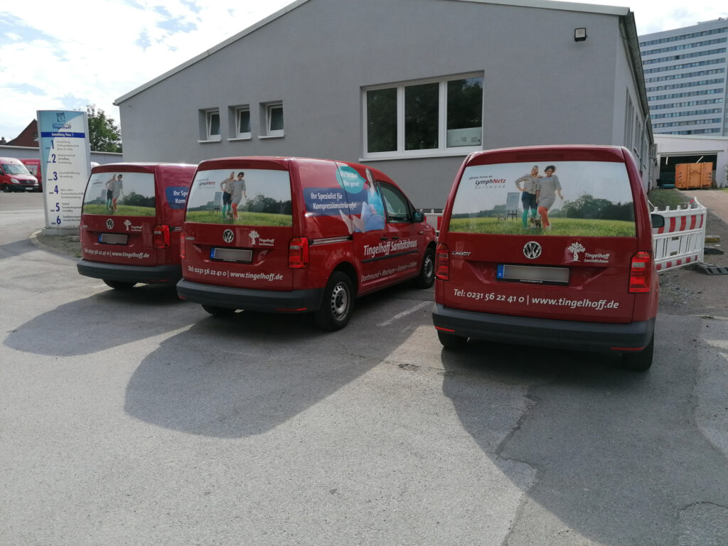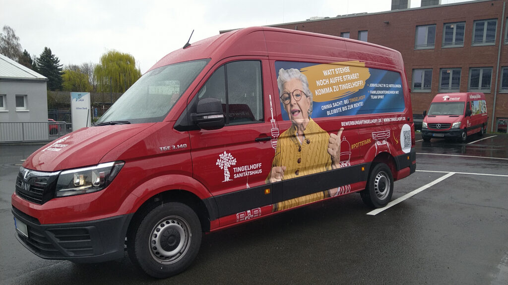 Für das Sanitätshaus Tingelhoff GmbH durften wir eine komplette Flottenbeschriftung umsetzen. Dabei wurden Fahrzeuge in unterschiedlichen Größen mit hochwertigen Voll- und Teilfolierungen gestaltet. Das moderne Design sorgt nicht nur für eine starke Markenpräsenz, sondern auch für eine professionelle Außenwirkung. Dank langlebiger Hochleistungsfolien bleibt die Beklebung auch bei täglicher Nutzung widerstandsfähig und farbintensiv.